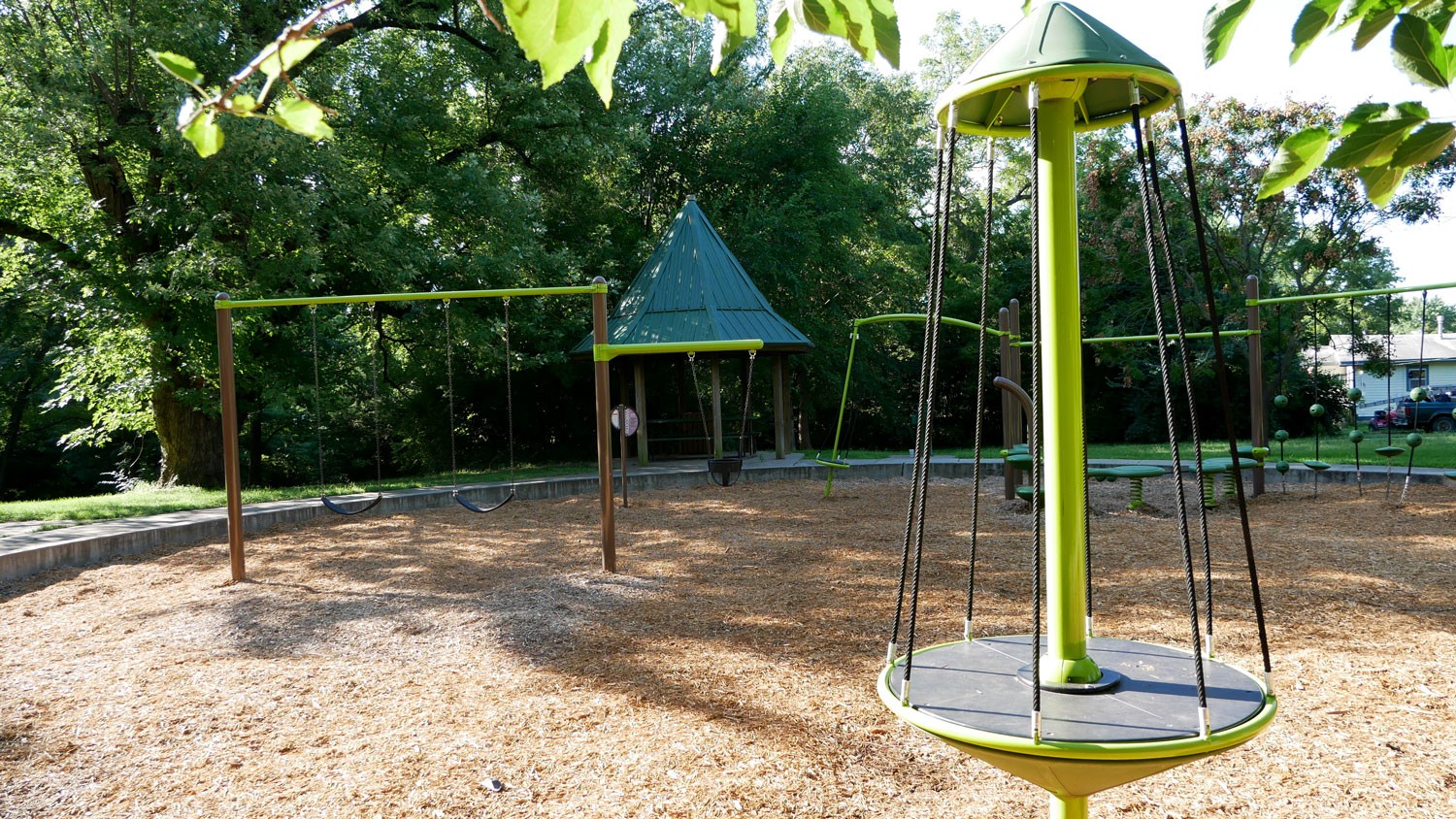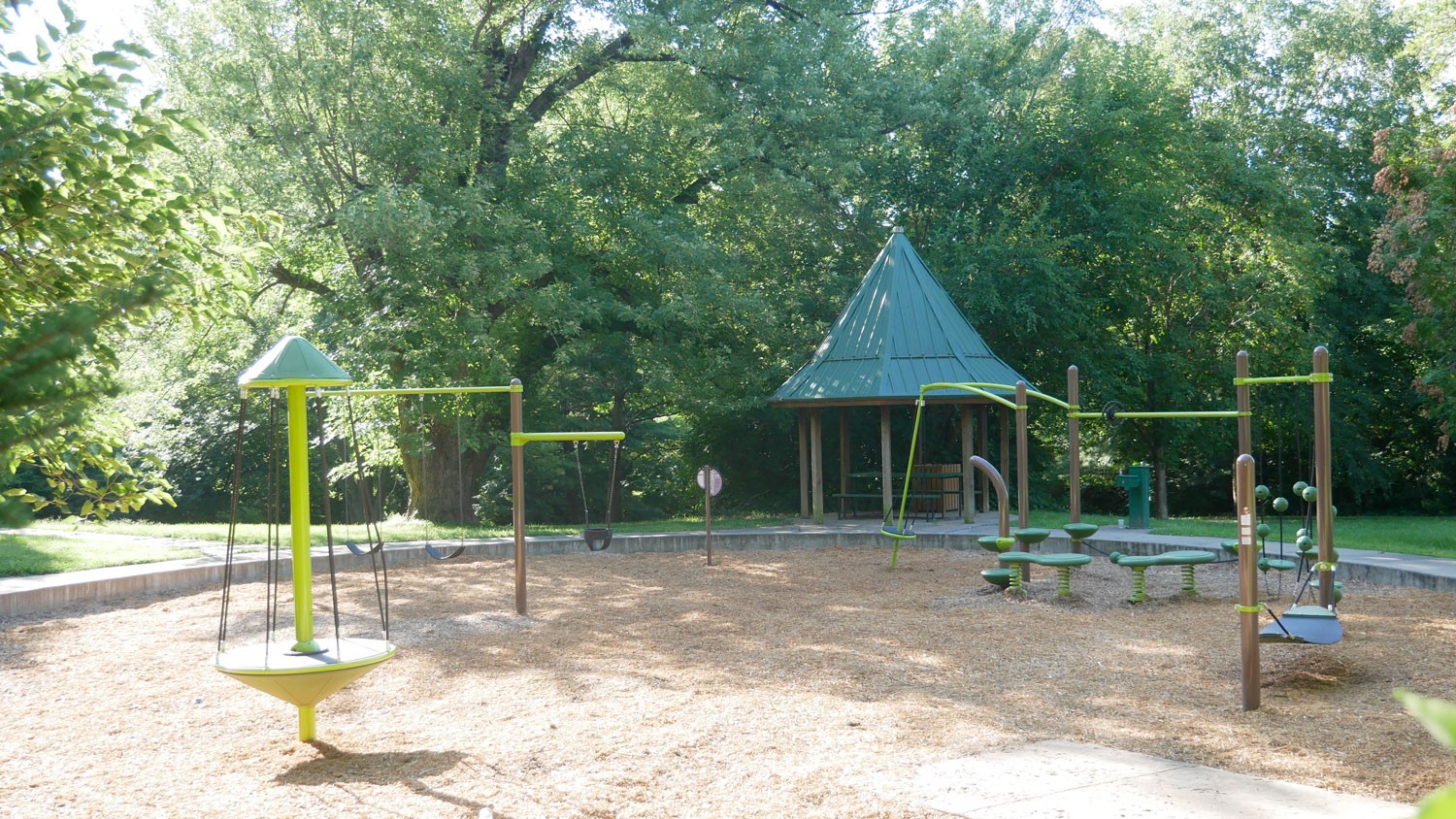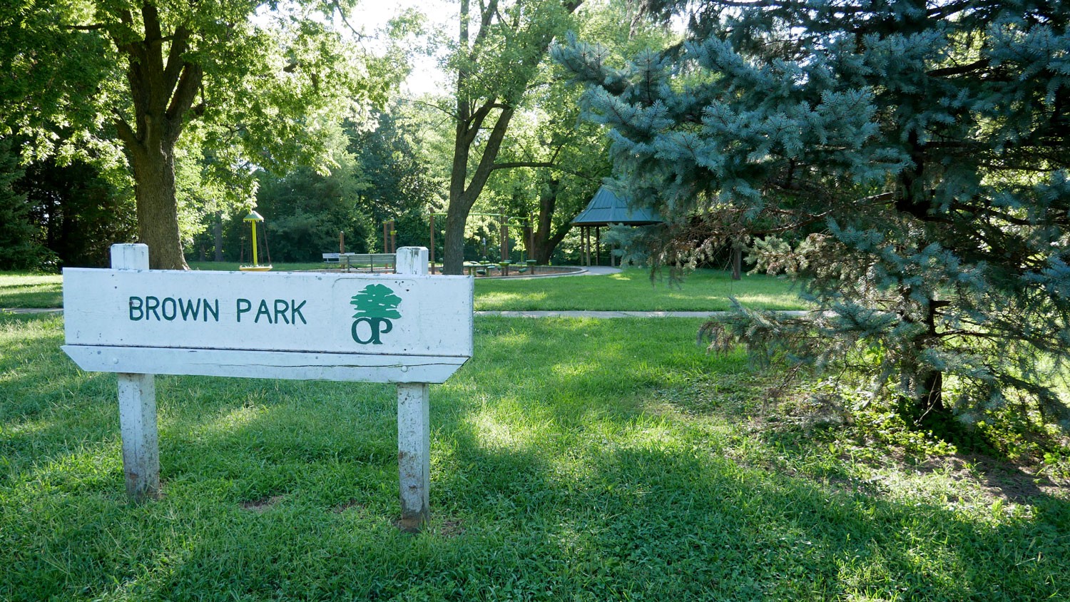 Brown Park is a small park in the North Overland Park Hills neighborhood with a playground, swings, park benches, and a small shelter with picnic tables.