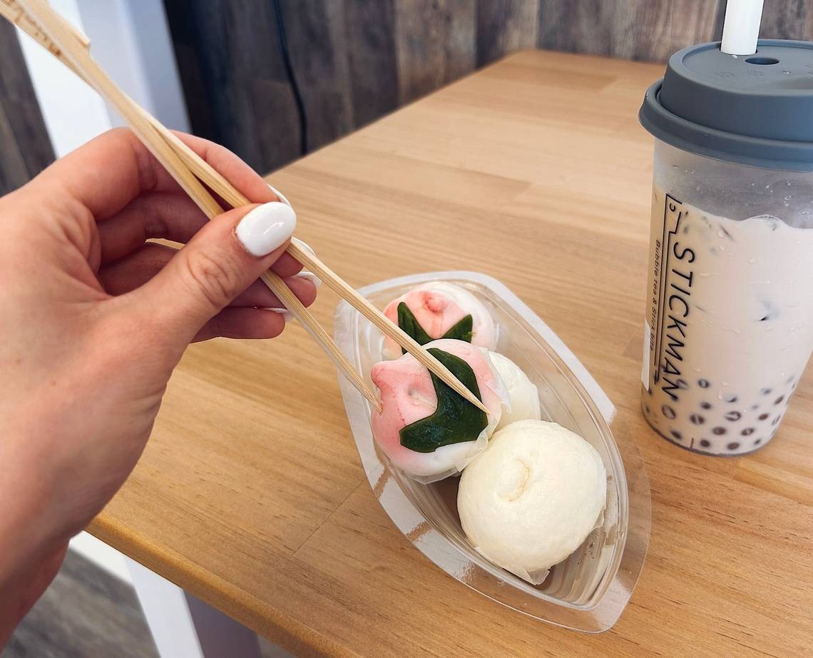 Stickman sells milk tea with a variety of boba flavors: brown sugar, strawberry, lychee and more. It also offers dumplings, available in custard and red bean flavors.