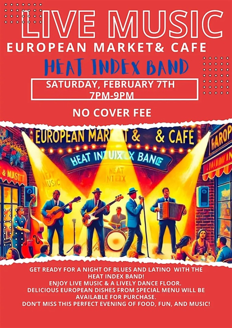 Get ready for a night of Blues and Latino with the Heat Index band! Enjoy live music, a lively dance floor, and our delicious menu of European dishes that will surely surprise and delight.