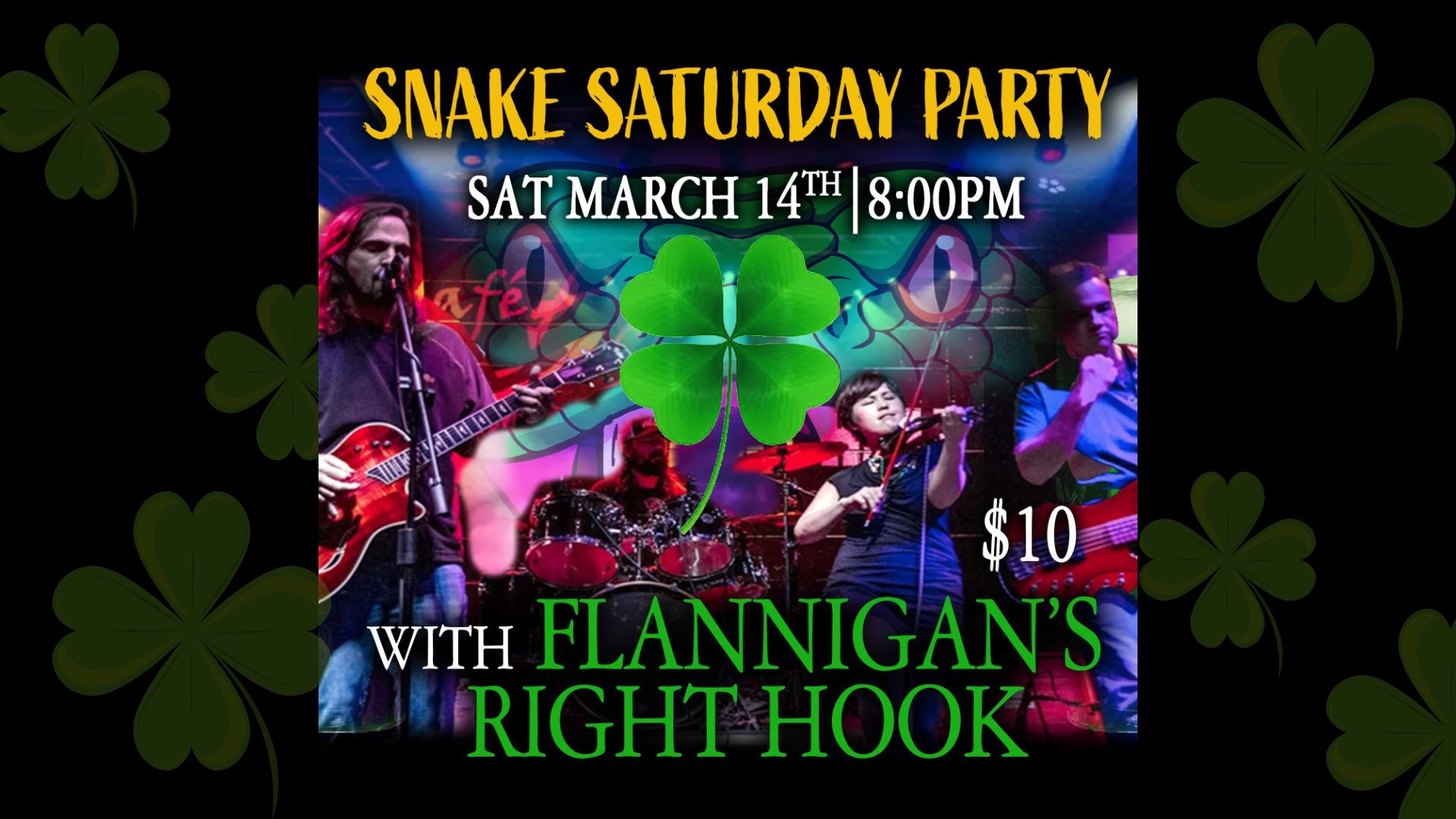 Celebrate St. Paddy's on Snake Saturday with the best Celtic rock band in KC. Flannigan's Right Hook takes the stage for a night of music and revelry. Good times, green beer and shenanigans for all!