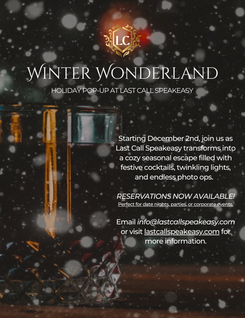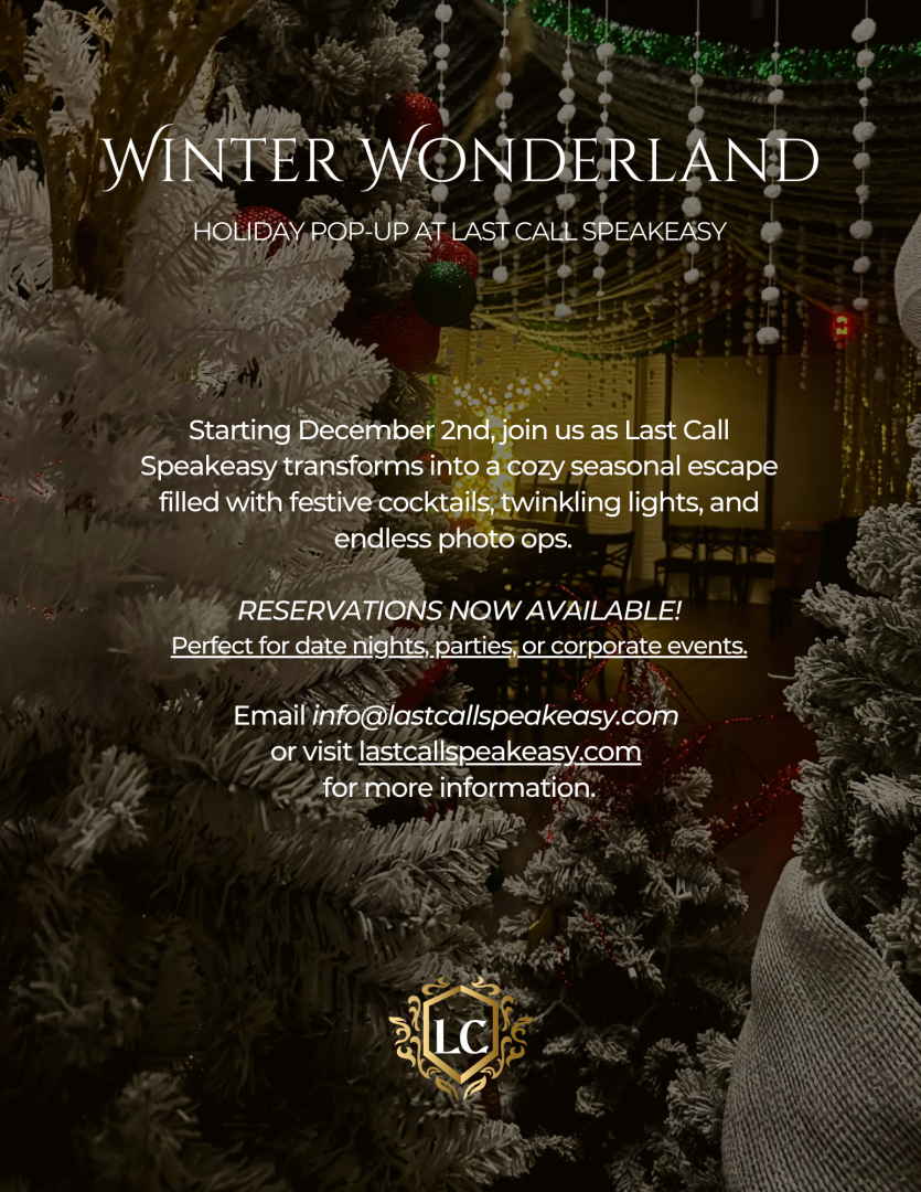 Last Call Speakeasy transforms this season into a cozy holiday escape. Twinkling lights, festive decor, and seasonal cocktails create a warm, magical atmosphere where friends gather, laughter flows, and every night feels like a celebration. Limited reservations available. Make yours online today.